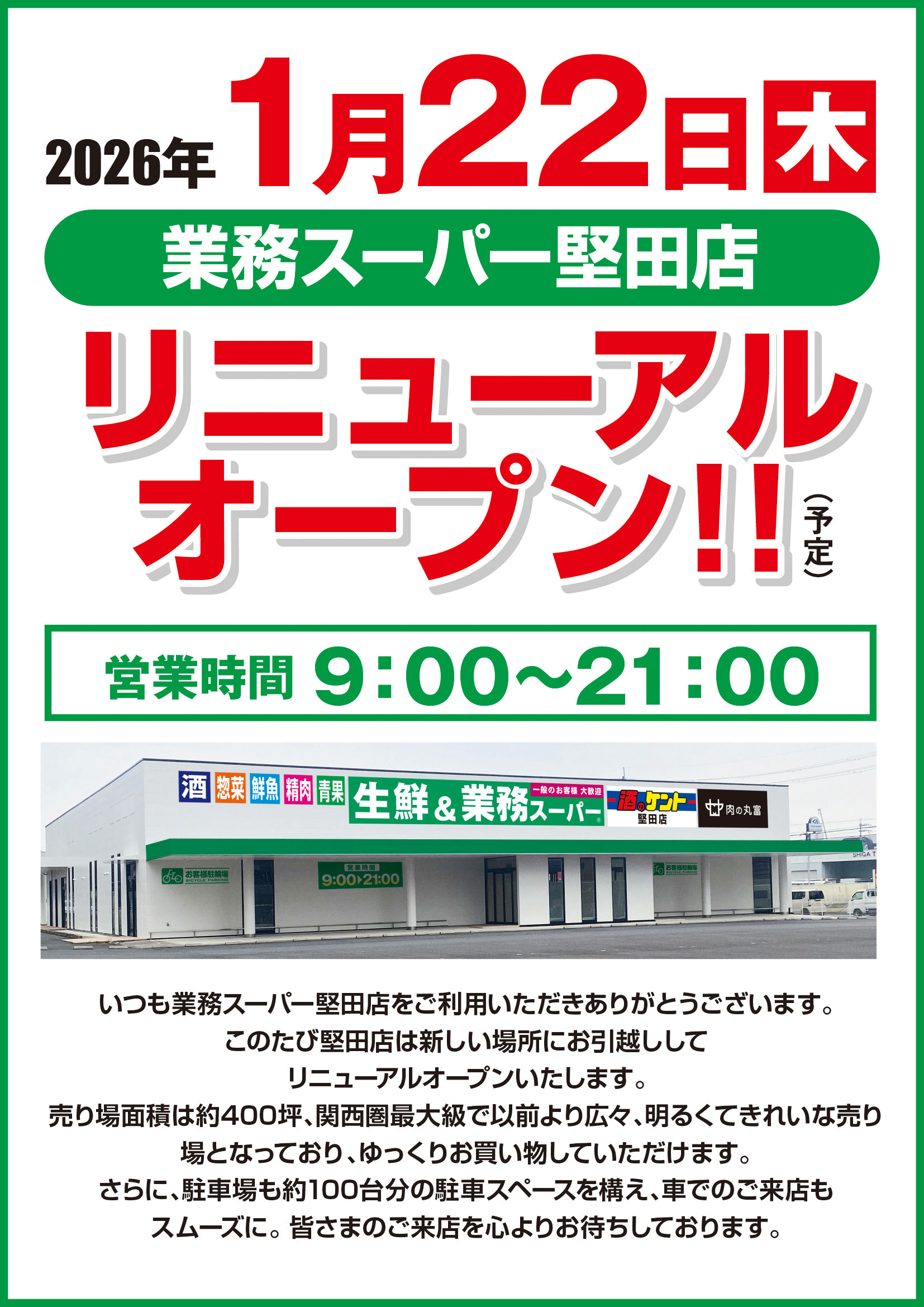 業務スーパー堅田店★移転してリニューアルオープン!! 2026.01.21 業務スーパー 堅田店 \移転してリニューアルオープン!!!/ オープン4日間が大特価!お菓子☆お酒☆飲料☆がお買い得!チラシはこちらから。 Tweet 生鮮スーパーケント東寺店限定★毎月恒例 月末大感謝祭...