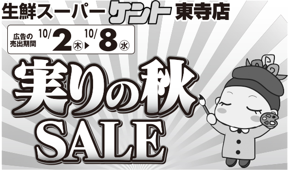 生鮮スーパーケント生鮮スーパーケント東寺店限定★実りの秋SALE開催!!! 2025.10.01 生鮮スーパーケント東寺店では2025年10月2日(木)~10月8日(水)まで実りの秋SALEを開催いたします。お菓子☆お酒☆飲料☆がお買い得!チラシはこちらから。 Tweet 業務スーパー甲西中央店 店舗移転に伴う休業のお知らせ