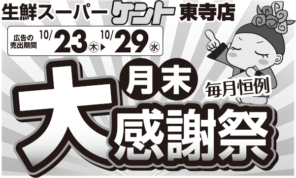 セール生鮮スーパーケント東寺店限定★毎月恒例 月末大感謝祭開催!! 2025.10.22 生鮮スーパーケント東寺店では2025年10月23日(木)~10月29日(水)まで毎月恒例 月末大感謝祭を開催いたします。お菓子☆お酒☆飲料☆がお買い得!チラシはこちらから。 Tweet 秋の新商品フェア 開催!& 甲西中央店 移転してリニ...