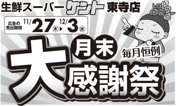 セール生鮮スーパーケント東寺店限定★毎月恒例 月末大感謝祭開催!! 2025.11.26 生鮮スーパーケント東寺店では2025年11月27日(木)~12月3日(水)まで毎月恒例 月末大感謝祭を開催いたします。お菓子☆お酒☆飲料☆がお買い得!チラシはこちらから。 Tweet 棚卸による時短営業のご案内